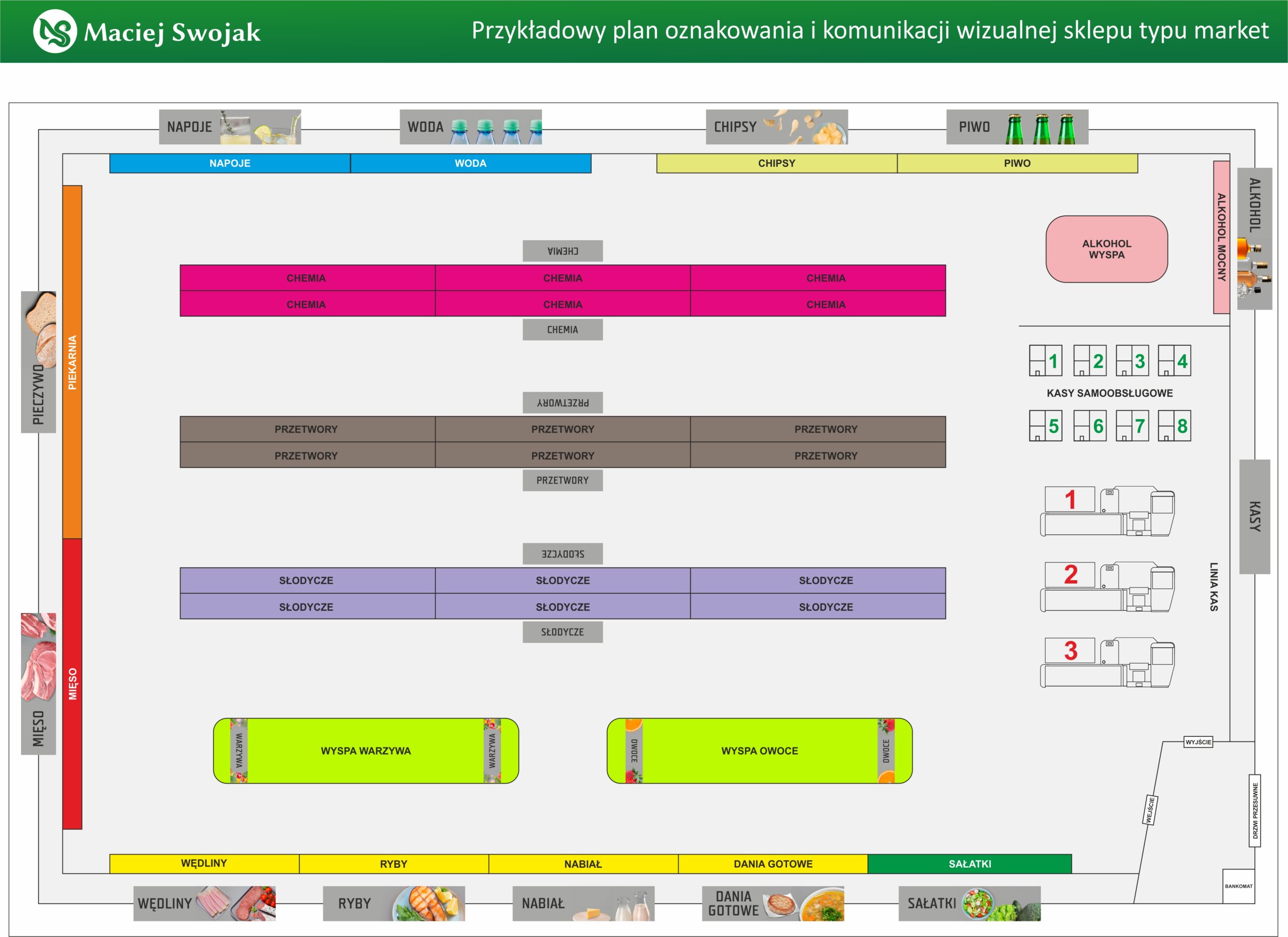 Przykładowy koncepcyjny projekt systemu oznakowania wnętrz sieci sklepów spożywczych, obejmujący opracowanie spójnej komunikacji wizualnej oraz rozmieszczenia materiałów informacyjnych i reklamowych w przestrzeni handlowej. Opracowane prace bazują na istniejących planach architektonicznych wysłanych od klienta oraz wytycznych związanych z różnymi możliwymi formatami sklepów. Celem projektu jest ujednolicenie komunikacji wizualnej wewnątrz sieci oraz wizualne zagospodarowanie przestrzeni.